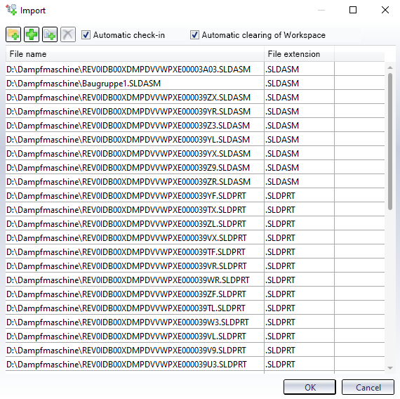 You can use the checkbox Automatic clearing of Workspace to control whether the affected files should be removed directly from the workspace after the batch import has been performed. This option may be useful if repeated loading of the same parts into the workspace affects the general performance. Documents that are already in the workspace at the time of import are not affected by the clearing procedure.