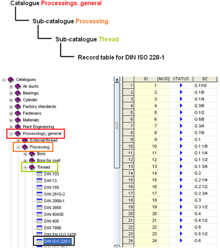 A special sub-folder of the CATALOGUES folder is the FACTORY STANDARDS folder. The user-specific catalogues are filed here. For example, you are enabled to save 2-D, 3-D parts, assemblies or type beams directly from the HiCAD drawing in individual catalogues. These use-specific catalogues can be created, managed and processed with the Catalogue Editor. Individual colour settings, materials or cutting and embossing dies can be managed by factory standard catalogues.