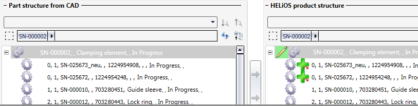 - The CAD ->Product structure window will be displayed. The product structure in HiCAD (left-hand window) and the product structure in HELiOS (right-hand window) will be compared. In the HiCAD product structure (left) you will see the selected article with its sub-items. You can now transfer the first sub-item level. The green markers of the parts in the left window indicate that these articles do not exist in the product structure.