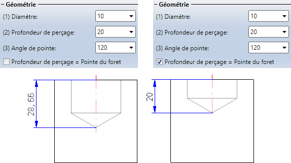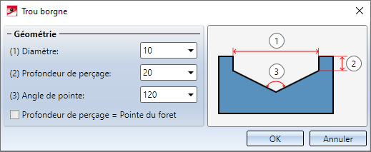 1. Indiquez le Diamètre, la Profondeur de perçage et l'Angle de pointe. Au moyen de la case Profondeur de perçage = Pointe du foret, vous pouvez déterminer la profondeur du perçage. Si la case est cochée, la profondeur du perçage correspond alors à la pointe du perçage.