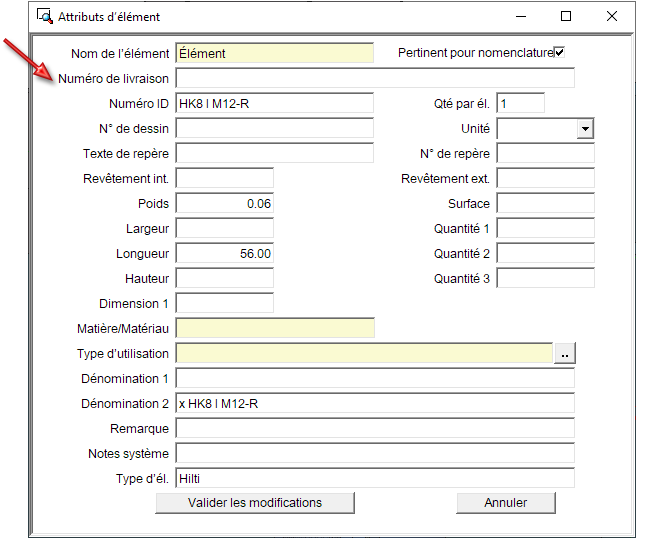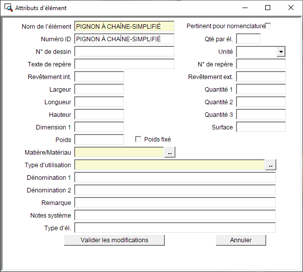 À l'insertion d'éléments du catalogue, comme les profilés, les vis, les écrous, etc., le type d'élément sera entré automatiquement dans le masque des attributs. |