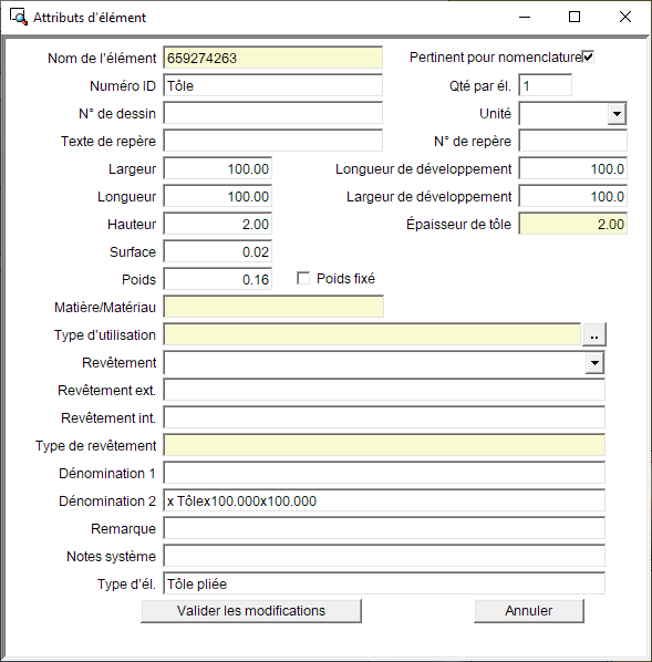 Pertinent pour nomenclature. - Appliquez les données saisies en cliquant sur le bouton Valider les modifications ou en appuyant sur la touche ENTRÉE (Retour). Au moyen de la touche ECHAP ou du bouton Annuler, vous pouvez mettre fin à la fonction sans enregistrer les modifications.
