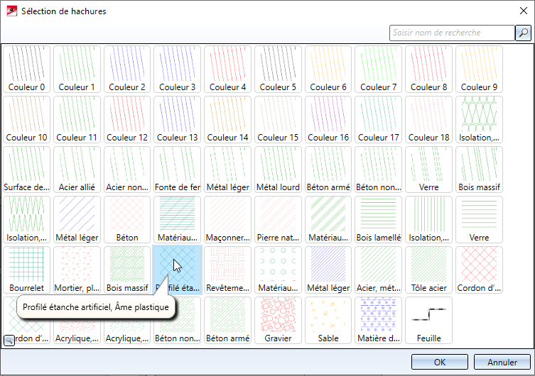 . La fenêtre de dialogue Sélection de hachures s'ouvre. En déplaçant le curseur sur un des motifs, d'autres informations à son sujet s'affichent. Par un clic sur le symbole de la loupe, en bas à gauche, il est également possible d'agrandir l'affichage des motifs.