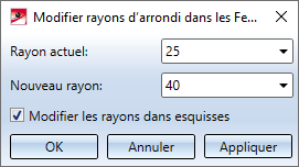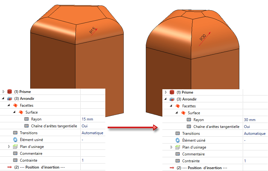 Standard 3D > Usiner > Arrondir > Modifier le rayon d'arrondi dans les Features