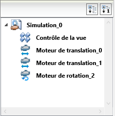 À gauche de la fenêtre d'ancrage, l'arborescence de la simulation est affichée. Tous les moteurs définis de la simulation sélectionnée y sont listés. Les nouveaux moteurs prennent automatiquement un nom particulier (Moteur de translation_0, Moteur de rotation_1, …).