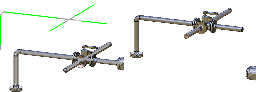 A common use case for route change is to move the end of a pipeline without directly reaching the end point. In this case no fixed points are set at those free ends of the pipeline which follow on the side of the graphic cursor.
