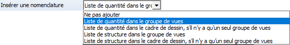 Une liste de quantité/de structure sera ajoutée toujours à l'intérieur du groupe de vues. La position de la nomenclature sera déterminée par la liste de choix Position dans groupe de vues.