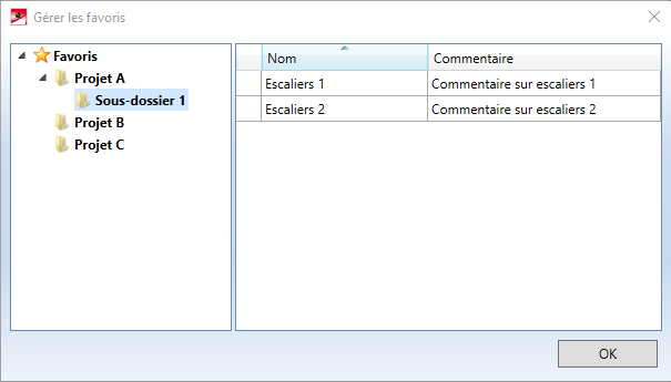 Veuillez noter que les favoris appartiennent toujours à une boîte de dialogue. C'est pourquoi, lorsque vous activez par exemple la gestion des favoris dans la boîte de dialogue du configurateur d'escaliers, seuls les favoris relatifs au configurateur d'escaliers vous seront alors affichés.