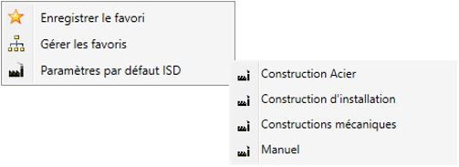 Il existe également des paramètres prédéfinis par ISD fournis dans HiCAD : les Préconfigurations ISD et Paramètres par défaut ISD. Vous les trouverez dans certaines fonctions, comme le repérage (positionnement) ou le configurateur d'escaliers. Si ces préconfigurations sont caractérisées par le symbole d'usine