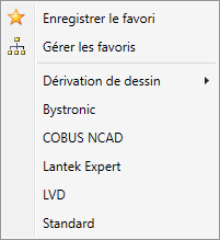 Tous les paramètres de la fenêtre peuvent être sauvegardés comme favoris et réutilisés pour de nombreuses fonctions. La gestion de ces favoris s'opère grâce à des fonctionnalités, avec lesquelles vous pouvez renommer, supprimer, importer, exporter et regrouper les favoris dans un dossier.