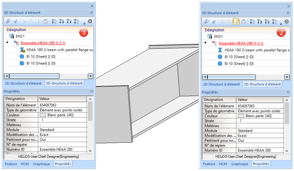 L'image montre une construction Acier à gauche comme ensemble "normal" (1) et à droite comme ensemble de structure.