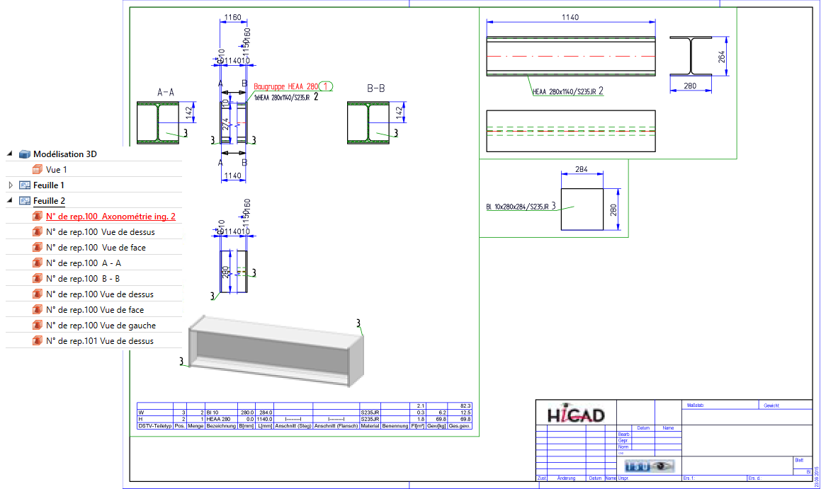 À l'insertion de jonctions d'Acier entre deux profilés, un ensemble pertinent pour la nomenclature sera créé pour chaque profilé, et structuré selon les directives DSTV. Cela signifie que l'ensemble contient chaque profilé comme élément principal d'ensemble et, au même niveau, les composants de la jonction appartenant à chaque profilé. En fonction du cas de figure de la construction, il peut arriver, dans de rares cas, que la structuration selon DSTV ne soit pas exécutée. Cela peut être évité par l'utilisation d'ensembles de structure.