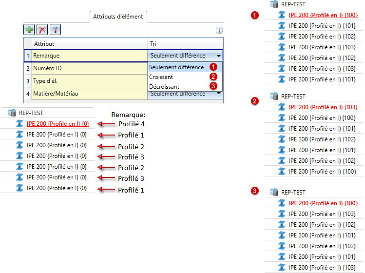 À droite, on voit en fonction de l'attribut d'élément Remarque quel effet les différents critères de tri auront sur l'attribution du numéro de repère. Pour l'attribut Numéro ID, Type d'élément et Matière/Matériau a été sélectionné à chaque fois Seulement différence.