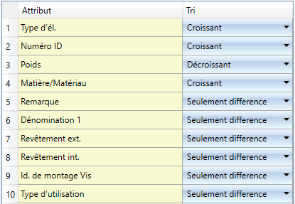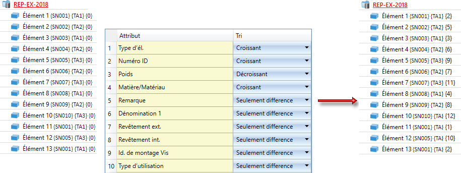 Veuillez noter que l'ordre des critères distinctifs ainsi que le tri sélectionné influencent l'attribution des numéros de repère.