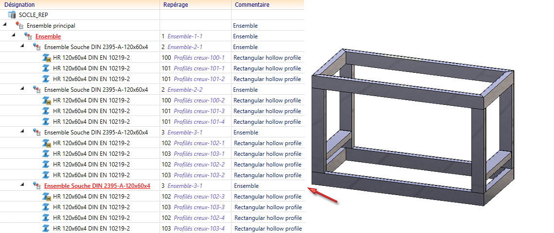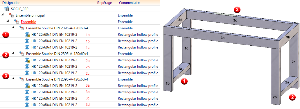Admettons la scène d'Acier ci-dessous se composant de trois ensembles (type d'élément attribut $05) qui se composent eux-mêmes de profilés creux du même type (attribut $05). Les ensembles 1 et 2 sont identiques, de même que les éléments 1b, 1c, 2b et 2c. L'ensemble 3 se compose de quatre profilés, dont chaque fois deux identiques, à savoir 3a et 3c d'un côté, et 3b et 3d de l'autre.
