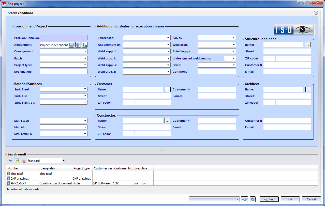 When you call the function, the dialogue window for project data search will be displayed.