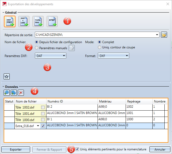 Vous devez sélectionner ici pour les fichiers DXF/DWG si vous souhaitez exporter les contours de coupe (Uniq. contour de coupe, les zones et angles de pliage dessinés ne seront alors pas pris en compte) ou la projection développée complète (Complet). |