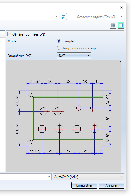 Si vous avez élaboré la projection développée avec un paramétrage pour par ex. LVD, Bystronic, Cobus ou Lantek Expert, les paramètres seront pris en compte lors de la création du DXF.