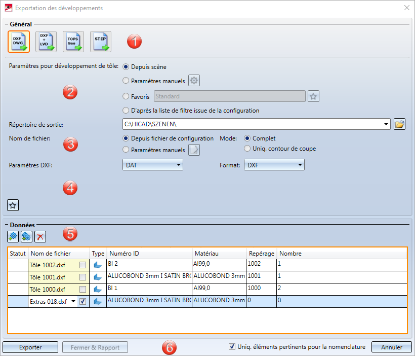 Vous devez sélectionner ici pour les fichiers DXF/DWG si vous souhaitez exporter les contours de coupe (Uniq. contour de coupe) ou la projection développée complète (Complet). |