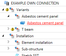 - Check whether HiCAD has created the part variable connection. To do this, right-click the assembly Asbestos cement panel and choose Properties > Part variables. In the Part variables dialogue window, check whether a variable called connection exists. If this is the case, right-click the variable and choose Delete variable. Then, close the dialogue window.