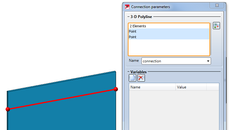 - When connecting this part with another part, HiCAD will search for intersection points of the c-edge of this part with the c-edge of the other part. These intersection points will be written as coordinates into the part variables of this part. For this purpose the variable connection (the name that we entered in the Connection parameters dialogue window; if we had entered something different there, the name of the variable would also be different) with the Type: List will be created. In this list variable, one structure variable per intersection point will be entered, which contains, under the name connect_coor, the coordinates of the intersection point. These must be used to place the connection-dependent processings (here: the bores) at the correct position.