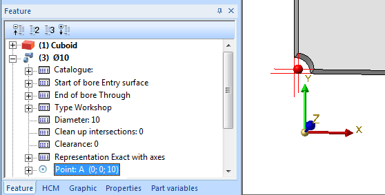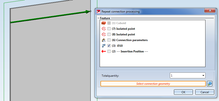 - Beneath Feature, select the bore. Total quantity: 1. After selecting the connection geometry it will be highlighted with a green arrow. Left-click on the arrow. After confirming with OK, two entries in the Feature log of the bore will be changed: