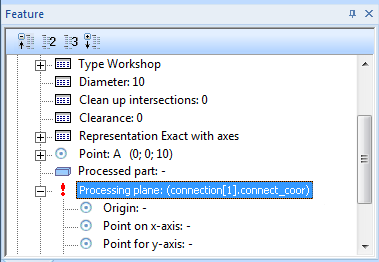 - For the connection the bore is to be placed via its processing plane, which is in turn automatically placed into the intersection point of the installed elements to be connected. To achieve this, set the Processing plane entry in the Feature log to the formula