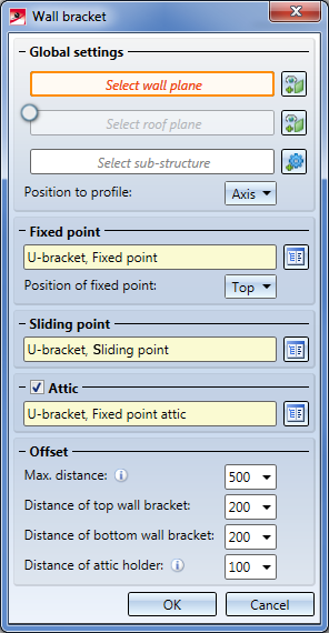 In the Offset area you can influence the vertical distances of the wall brackets. Use the Distance of top wall bracket and Distance of bottom wall bracket fields to specify the den exact distance of the top or bottom bracket from the top or bottom edge of the wall or the sub-structure profile. In between, wall brackets will be applied, with equal distances not exceeding the specified Max. distance.