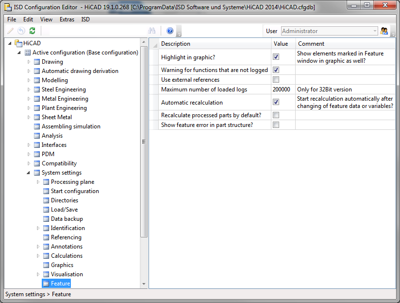 In the tree structure on the left side of the tool, select HiCAD > Active configuration (Base configuration) > System settings > Feature.