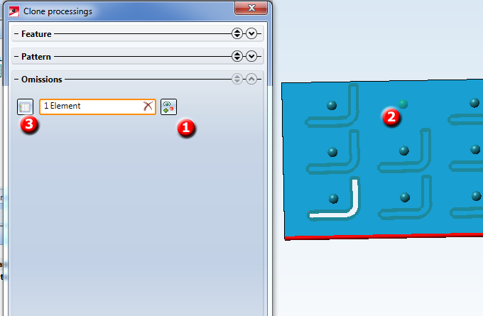 In the Omissions area you can specify individual clonings that are to be omitted. To do this, click on the Select omission button (1) and then identify individual omissions in the drawing (2).