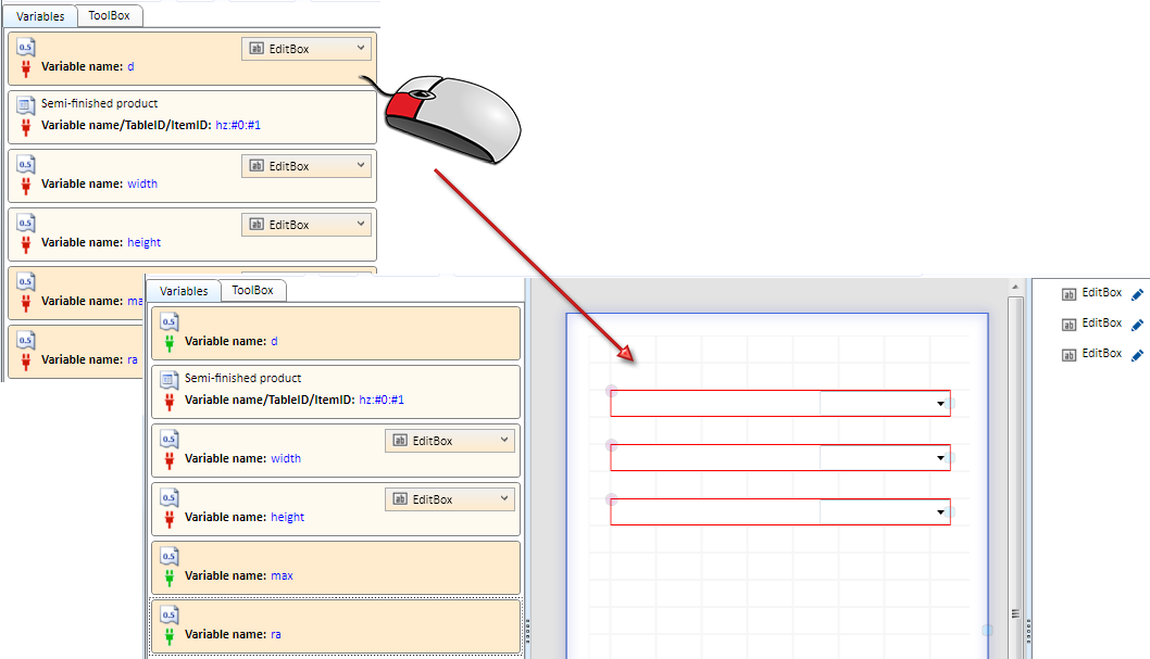Adding of variables listed in a tab to a dialogue takes place via Drag & Drop. Multiple selections of variables (hold down CTRL/SHIFT key) are also possible here. Which ToolBox object will be used for a variable depends on what has been selected in the respective selection box for the variable. The default setting is the variable type assigned in HiCAD. For instance, if the variable has the type Number, a ToolBox object of the type EditBox will be inserted when the variable is dragged into the dialogue (without changing the type). If the variable has the type List, an object of the type CatalogEntry will be inserted.