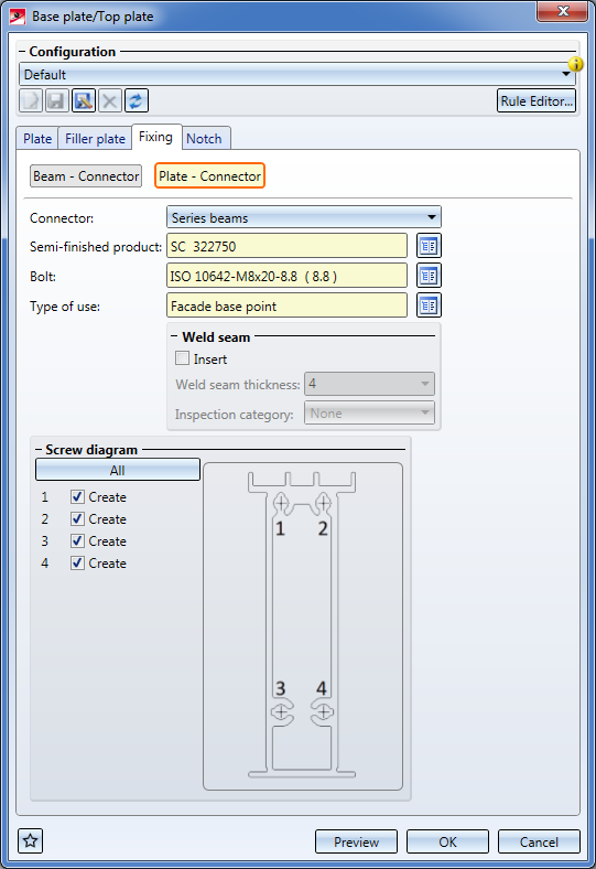 If the connection is created with bolts or screws, you can select beneath Screw pattern whether All bolts should be set for the spots intended for boltings on the profile, or if you want to omit some of them, by activating or deactivating the corresponding Create checkboxes. The miniature image on the right shows the positions of the bolts on the profile.