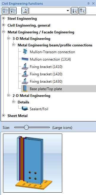 "Civil Engineering functions" docking window > Metal Engineering/Facade Engineering> 3-D Metal Engineering > Metal Engineering beam/profile connections > Base plate/Top plate