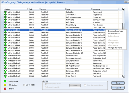 Definitions will be taken over from the library directory for older projects, which do not include these definitions. From the symbol libraries integrated in the project, the dialogue types defined by the user with codes between 500 and 599 as well as the special dialogue types for title blocks (600 to 799) will be taken over in the new administration of definitions. The attribute codes, added by the user in the ATTRCODE.DAT file will also be taken over. The definitions integrated and added to the project will thus be save with the project.