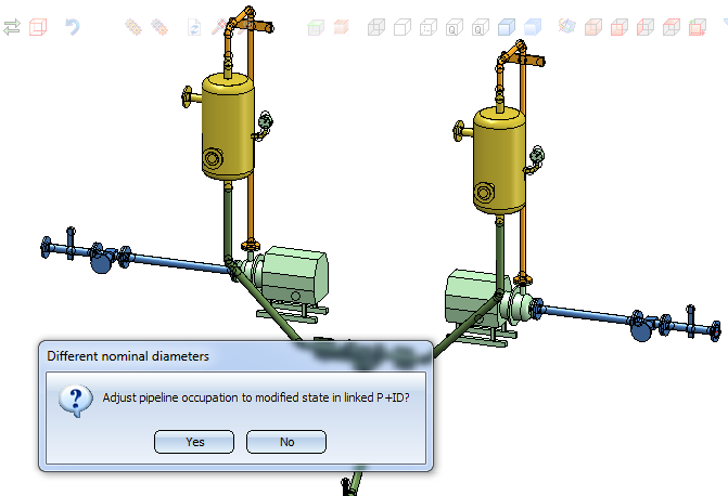 You have the option to change the nominal diameter of a pipeline in the P+ID, even if it pipeline parts have been subordinated to it by means of a part assignment. When changing the nominal diameter, existing part assignments of subordinated pipeline parts will be adjusted accordingly; this will be indicated by a corresponding message. If more that one matching part will be found, one of these part needs to be selected.