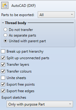 On the right-hand side of the dialogue window, you can specify the export options. These settings can be pre-set in the Configuration Editor at Interfaces > General 3-D interfaces. Via the symbol