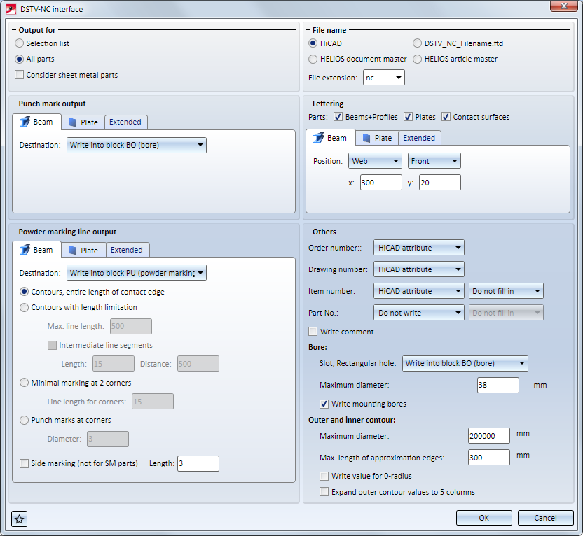 > Change - Settings). If you change the attribute for the corresponding file there (and save the file), it will be written to the relevant place in the DSTV-NC file. The advantage of this is that various information can be written into both places in the DSTV-NC file. Furthermore, you can specify a Maximum diameter for bores beneath Bore. By deactivating the Write mounting bores checkbox you can exclude bores from the export.