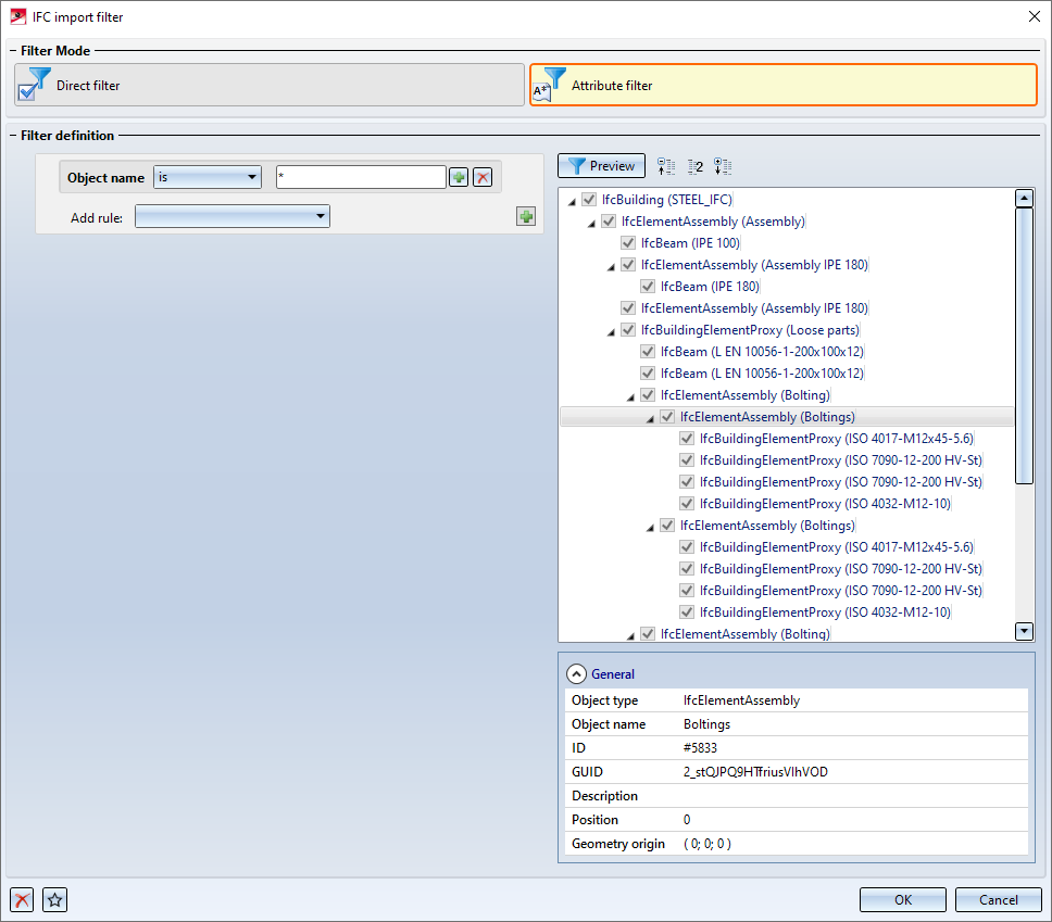 If the Filter option is active, the IFC import filter dialogue window is displayed after clicking Open. Here you can restrict the parts to be imported by specifying direct filters or attribute filters.