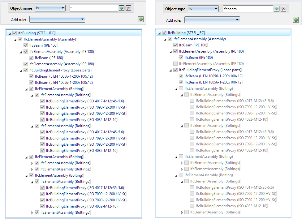 The Preview can be switched on and off. If it is switched on, the filter is applied immediately after each change to the filter rules, that is, the objects in the tree structure that fulfil the filter conditions are activated immediately on the right of the dialog box.