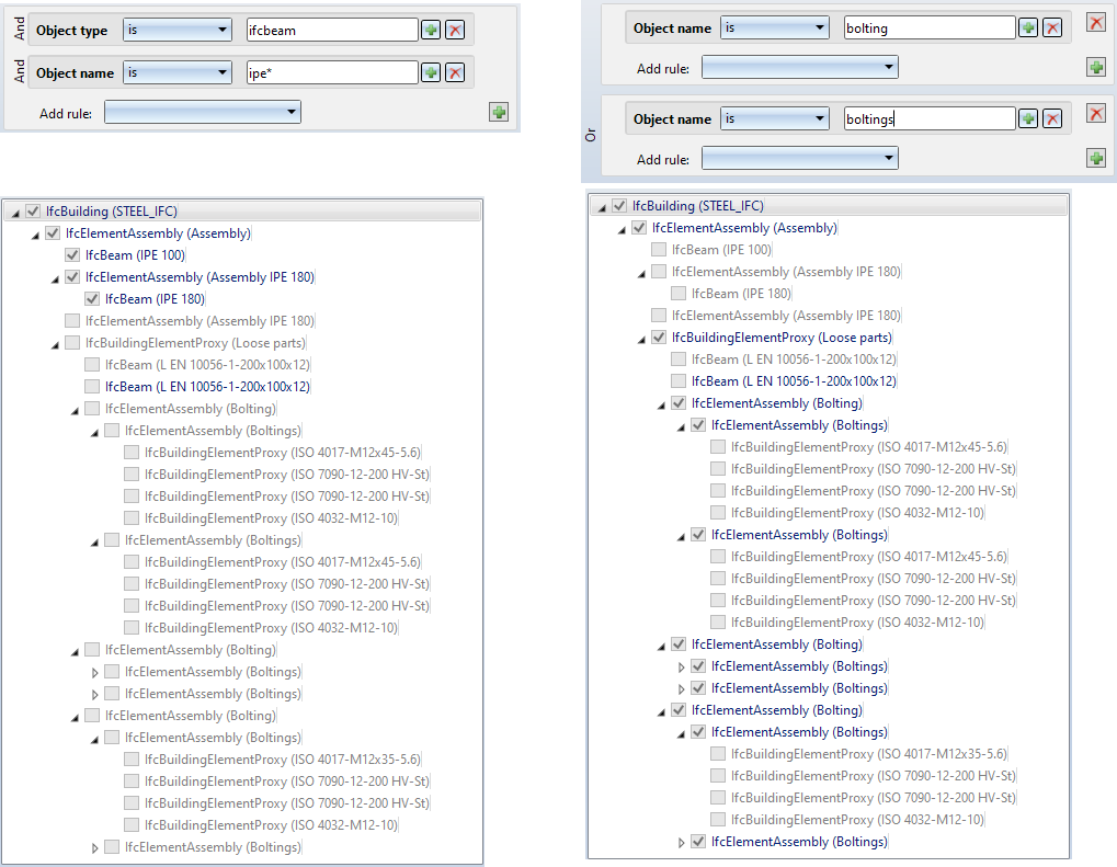 Instead of direct filters, attribute filters can also be used. Here you can filter the structure according to the attributes Object name, Object type, Designation and GUID. Several filter criteria can be combined with AND or OR.