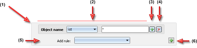 Attribute filters can consist of one or more rule blocks, each rule block being identified by a grey rounded rectangle (1). A rule block consists of one or more rules, which can be linked by AND or OR. Each rule (2) contains the attribute to be filtered by and the condition it must fulfill. This condition consists of an operator and a string, where the operators here are and are not allowed. The string can contain the wildcards *, ? and \.