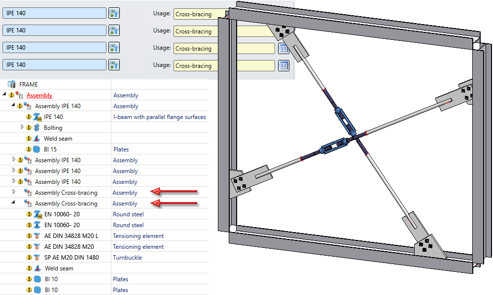 The two marked assemblies then have the usage Cross-bracing. If the model drawing is exported as an IFC file using the part filter Steel Engineering > Steel Engineering assembly > Cross-bracing, the parts of the assemblies will be combined into one part each.