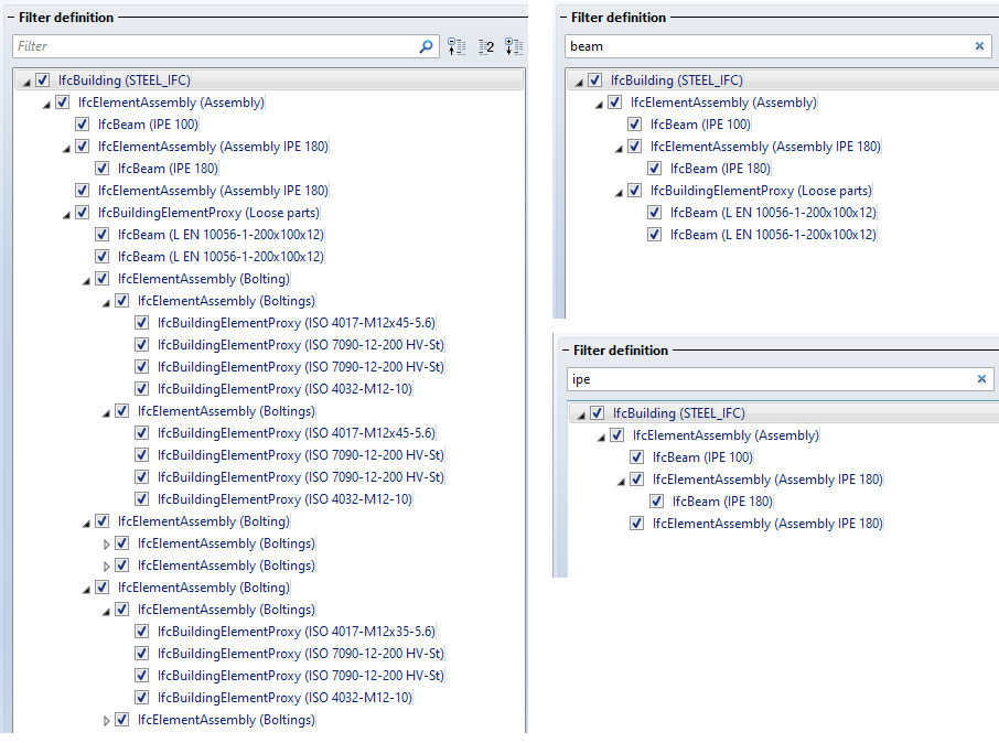 In addition, you can enter a string at the top of the dialogue window, according to which the import is to be filtered. This can be any sub-string of the IFC name or IFC type. Example, for example beam. The tree structure is adjusted immediately. If you then enter another sub-string, the tree structure is filtered further.