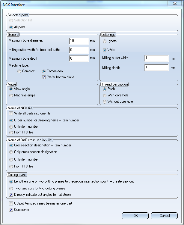 Die NCX-Schnittstelle legt dann für jedes Teil eine NC-Datei mit der Dateinamenserweiterung .NCW und für Profile zusätzlich eine DXF-Datei mit dem Querschnitt des Profils an.