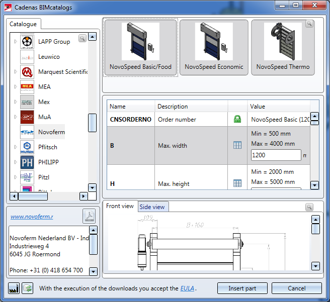If you have Internet access, the product catalogue BIM catalogs.net by CADENASPartSolutions will be available to you. To access the catalogue, open the Drawing tab and choose Insert Part > Exp.