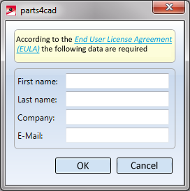 When you call the function for the first time, a dialogue for the recording of your customer data will be displayed. These data are required according to the End User License Agreement (EULA). please enter your name, company and your E-mail address here.