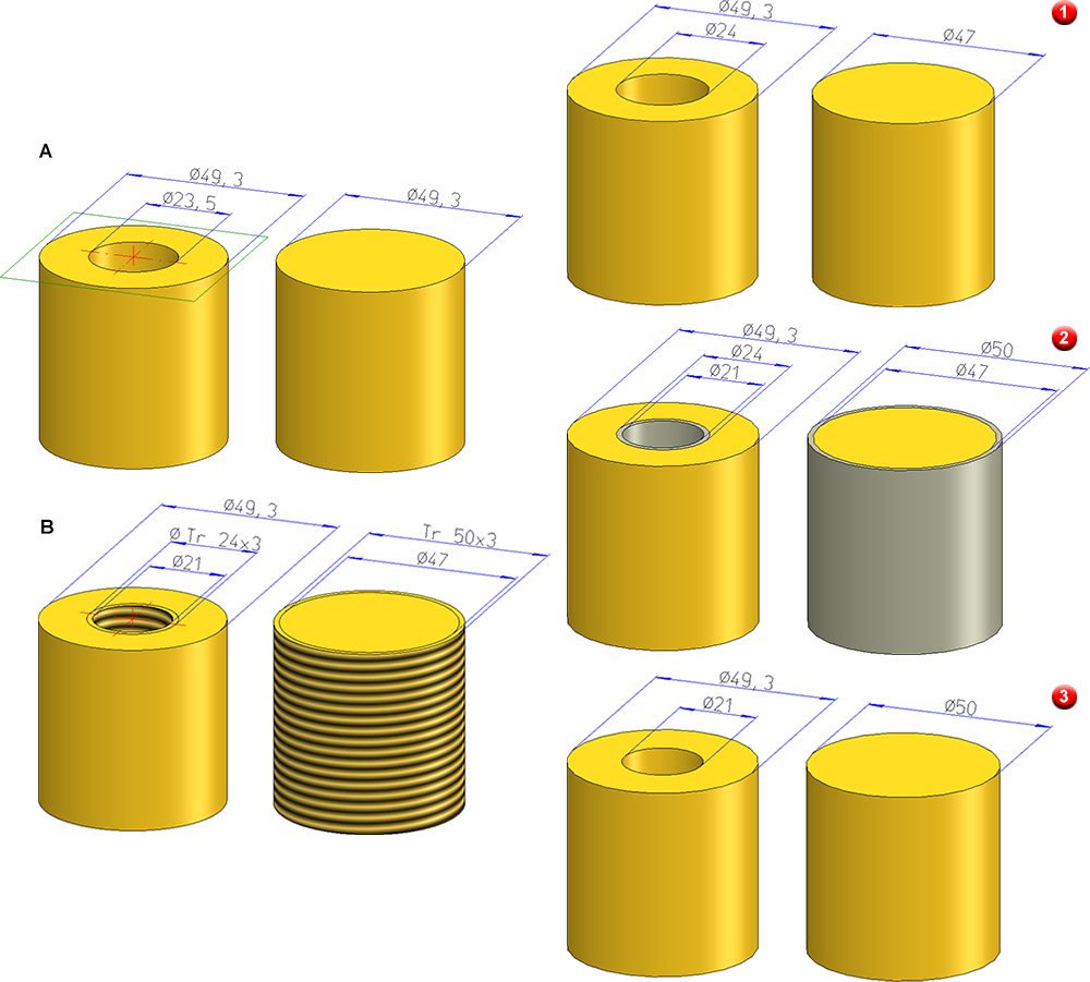 DN = Nominal diameter, KERDI = Core diameter of internal thread The image below shows the example of a cylinder with diameter 49.3. A bore with diameter 23.5 was inserted in the left cylinder (A) and then a internal thread DIN 103, Tr 24x3. On the right, an external thread of type DIN 103 Tr 50x3 was inserted (B).