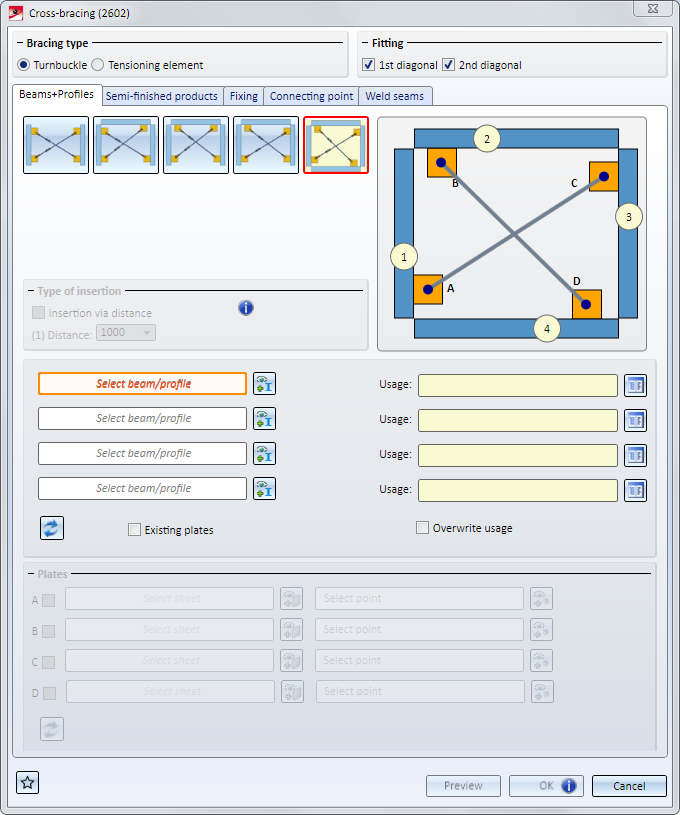 Here you can specify how the diagonals are to be fixed on the beams, and the turnbuckles or tensioning elements to the diagonals.
