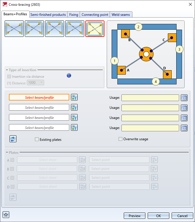 The cross-bracing is inserted between two beams. If desired, the distance between the lower edge of the first connecting plate on the beam and the upper edge of the second connecting plate on the beam can be determined under Type of insertion. If no distance is entered, the insertion is applied centrally.