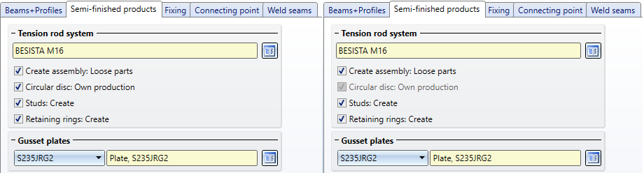 If this checkbox is activated, the circular disc or cross anchor and the studs and retaining rings for fixing the tension rod system are combined into a structure assembly called Loose parts. If the checkbox is deactivated, the studs and retaining rings are assigned to the assemblies of the corresponding tension rod system. In this case the circular disc or cross anchor is inserted as an individual part.